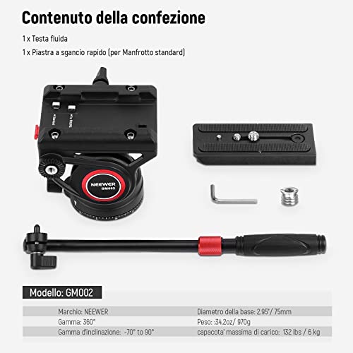 NEEWER Testa Fluida per Treppiede Video con Piastra a Sgancio Rapido Compatibile DJI RS Gimbals Manfrotto, Manico Telescopico e Base Scalata (⌀75mm) Carico 8kg, Resistente per Videocamere DSLR, GM002