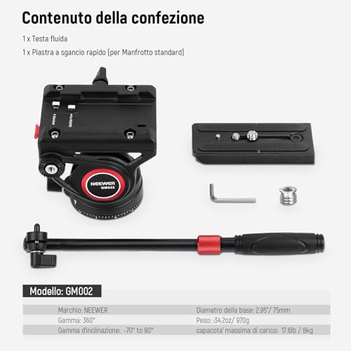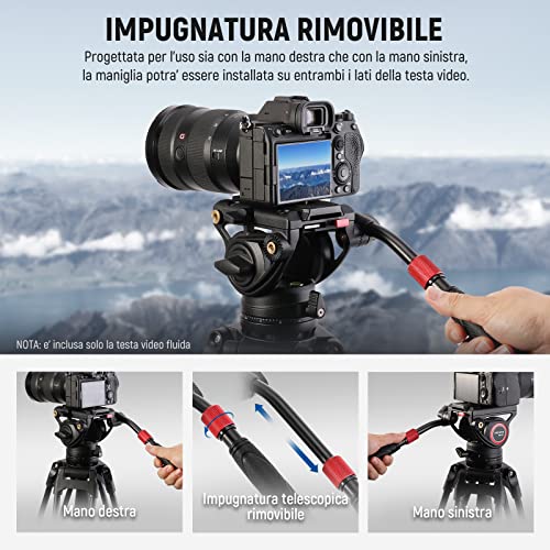 [Premium Testa Fluida per Treppiede] Eccezionalmente robusta, questa testa fluida professionale con integrato sistema di smorzamento e bilanciamento è realizzata in lega di alluminio di qualità elevata, è in grado di resistere ad ambienti difficili e offrire una massima portata di 8kg, che è perfetta per scattare foto e video nitidi in modo fluido.