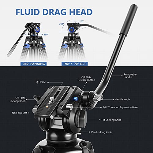 Neewer Treppiede video robusto in lega di alluminio, testa di trascinamento fluido, maniglia sinistra/destra, divaricatore di livello intermedio per DSLR fotocamere videocamere, ricarica fino a 15kg