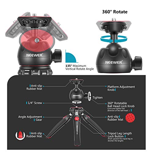 ALETEZZA & ANGOLO REGOLABILI: Il design a ingranaggio con A/B point abbinato a tasti rossi sulle gambe consente di regolare l'altezza del treppiedi tra 12,5cm e 22,5cm. Il treppiedi da tavolo è perfetto per le riprese a basso angolo. Tramite la testa a sfera panoramica, è possibile catturare una foto perfetta in qualsiasi angolo desiderato.