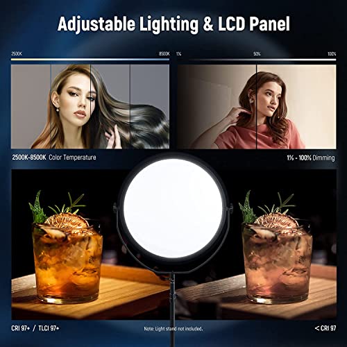[Illuminazione Regolabile & Schermo LCD] Con 234 bulbi LED bianchi freddi e altri 234 bianchi caldi, questa luce rotunda vanta un'emissione luminosa brillante, una luminosità regolabile tra 1% e 100% e una temperatura del colore variabile di 2500-8500K. Gli alti indici CRI e TLCI di 97+ garantiscono una resa cromatica fedele. Lo schermo LCD chiaramente mostra le impostazioni per una facile regolazione.