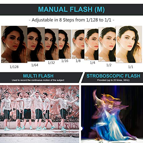 FUNZIONE POTENTE: La potenza del flash arriva a 200W. È regolabile in 8 step da 1/128 a 1/1. Supporta le modalità TTL, Manual, Multi, S1 & S2;