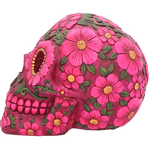 Coperto di fiori rosa, questo teschio umano rosa brillante è anche coronato di foglie verdi e viti