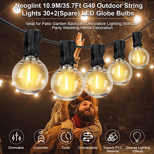 Neoglint G40 Catena Luminosa da Esterno 10.9M, Luci Esterno Lampadine Dimmerabile con 30+2 Lampadine LED(di Ricambio), Base E12,Controller e Funzione timer,per la Decorazione del Giardino-Bianco Caldo