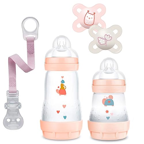 MAM - Set per neonati anti coliche Pretty Girl // 260 biberon anti-coliche 2 pezzi & MAM Skin Soft Silicone Ciuccio 2 pezzi + NIP + fascia portaciuccio +