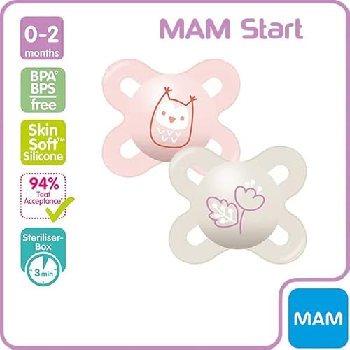 2 ciucci MAM Start in silicone con scatola per il trasporto sterilizzata. Il design extra piccolo e leggero di MAM Start è appositamente progettato per neonati prematuri. Il disco simmetrico è sempre ben posizionato in bocca. I fori per l'aerazione sono particolarmente buoni per la pelle, il disco arrotondato e i gommini sulla parte interna della targa.