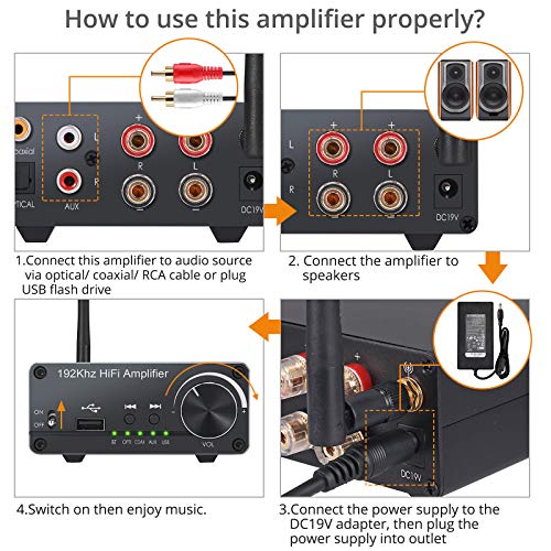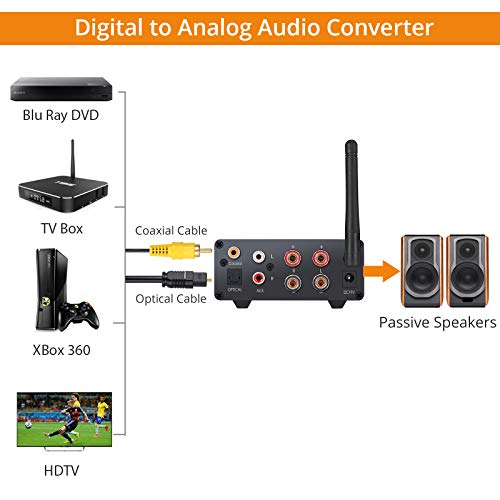 【Multifunzione】Combinazione di Amplificatore di Classe D e Convertitore Audio Digitale / Analogico. Ingressi: Bluetooth, Ottico, Coassiale, Aux (L / R) e USB;