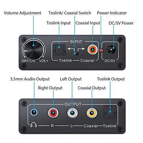 【【DAC Convertitore 192Khz】Converte Coassiale Ottico Digitale o Toslink ad Analogico RCA L/R Audio e Collega con un Dispositivo Esterno come Amplificatore via 3,5mm Cavo Auricolari. Supporta Realmente Frequenza di Campionamento a 32, 44.1, 48, 96 e Persino 192 KHz.