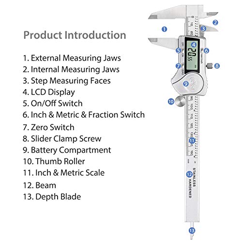 【Versatilità】Versatilità di Misurazione, Misura Interno ed Esterno, Profondità e Passo con Due Set di Ganasce e Sonda. con Modalità di Smart Sonno, Spegnimento Automatico dopo Minuti di Inattività per Risparmiare la Durata della Batteria e Ricordare la Posizione Quando è Spento.