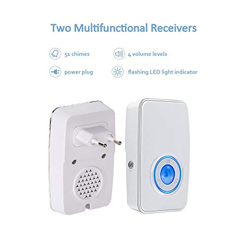 Nessuna batteria richiesta - AURTEC Campanello Senza Fili da Esterno Impermeabile IP44,Indicatore LED, 1 Trasmettitore Pulsante e 2 Ricevitori, 4 Volume Regolabile, 51 Suonerie (Bianco)