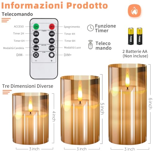 ️ Telecomando e funzione timer - Il set include un telecomando con timer e dimmer per creare un ambiente perfetto. È possibile controllare tutte le candele con telecomando (on / off, luminoso / dim, funzione timer 2/4/6/8 ore), regolare la luminosità e cambiare la modalità sfarfallio.