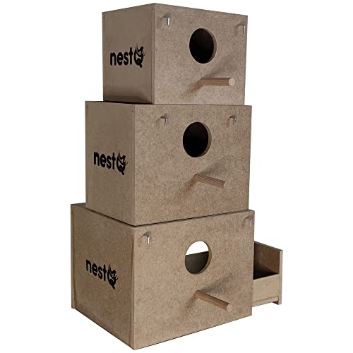 NestQ Nido per parrocchetti con trucioli per letto, casetta di allevamento in legno per uccelli, con ganci per gabbie per uccelli, 19 x 15 cm x 13,5 cm