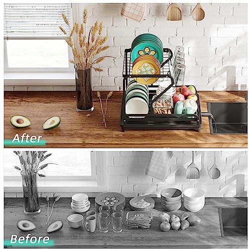 NETEL Scolapiatti da Cucina per Lavello a 2 livelli,Con Vassoio di Raccolta e Portabicchieri, Scarichi Rotanti,Scolapiatti Antiruggine per Bancone da Cucina e Portautensili- Nero 42 x 30 x 31.5 cm