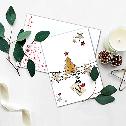 NEUSER PAPIER Set di 20 biglietti di Natale, formato DIN A6, in bianco, con albero di Natale e stelle, biglietti pieghevoli con buste, formato DIN C6, colore bianco, con stelle rosse, auguri di