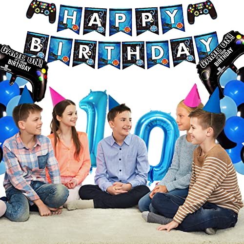 Pacchetto prezioso - 1 x striscione HAPPY BIRTHDAY, 1 x palloncino in alluminio blu da 40 pollici "10", 2 x palloncini per feste per videogiochi, 1 x carta GAME ON, 1 x carta BENVENUTO, 2 x carte Gamepad, 10 x palloncini azzurri, 10 palloncini blu, 10 palloncini neri, 1 cannuccia di carta