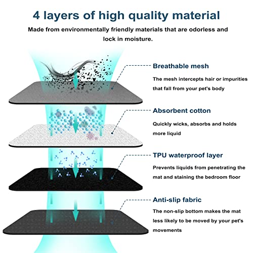 Rapido Assorbimento e Impermeabilità - Questo tappetini igienici è super assorbente, trattiene meglio l'umidità, previene le fuoriuscite e si asciuga rapidamente. Lo strato impermeabile in TPU protegge il pavimento in legno sottostante, così non dovrete mai preoccuparvi che il vostro animale domestico faccia pipì sul pavimento.