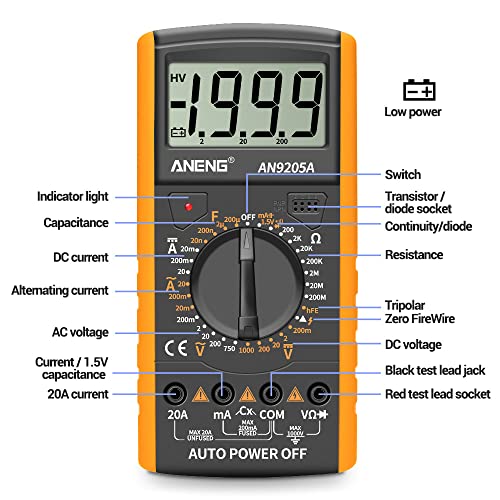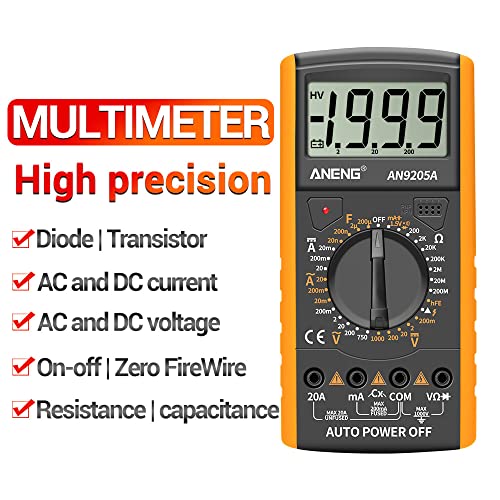 【Alta Sicurezza】 questo multimetro dt9205A soddisfa i requisiti della categoria di sovratensione iec61o1 0 ~ 1 e cat II 600V e doppio isolamento. Il prodotto è coperto con manicotto in gomma, in modo che il corpo principale abbia una maggiore resistenza agli urti alla caduta. Costruito in doppio fusibile, se è fuori portata, può soffiare nel tempo per proteggere gli utenti e multimetro