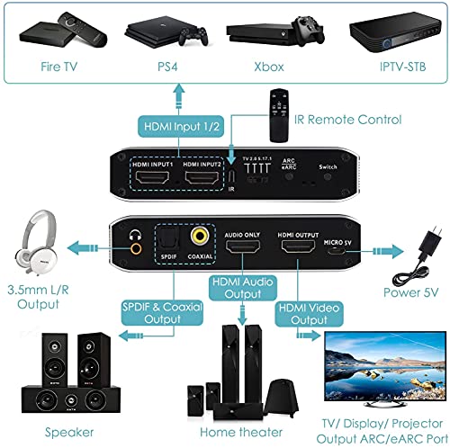 Interruttore HDMI 2x1 con estrattore audio: estrattore audio 4K HDMI 2.0 ad alte prestazioni. Ha 2 ingressi HDMI e 1 uscita HDMI con funzione di estrazione audio. Supporta le funzioni ARC e eARC. L'audio estratto può essere emesso tramite jack audio da 3,5 mm, Toslink SPDIF, coassiali e porte audio HDMI. Consente agli utenti di utilizzare il loro ricevitore audio esistente per ricevere 4Kx2K@60Hz, HDCP 2.3 contenuti audio. Supporta anche l'uscita HDMI e l'HDR a 10 bit (High Dynamic Range).