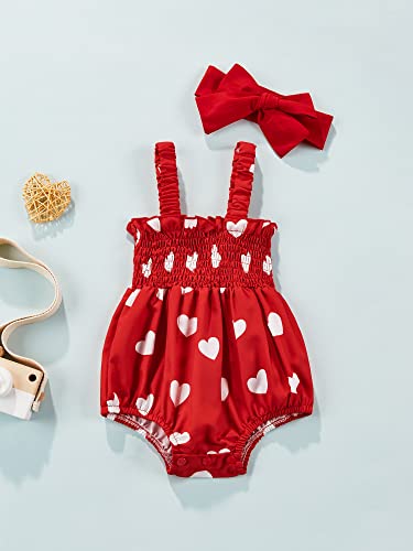 Newborn Baby Girl Halter Sleeveless Bodysuit Ruffle Stretchy Heart Print Jumpsuit with Bow Headband 2Pcs (Red, 6-12 Months)