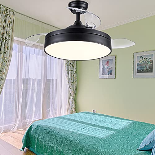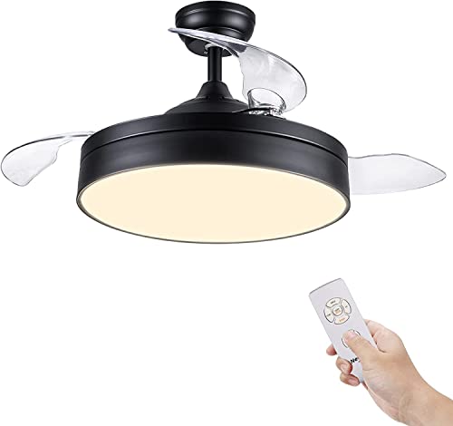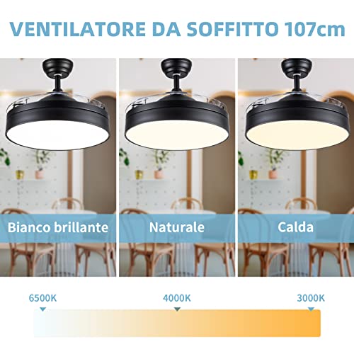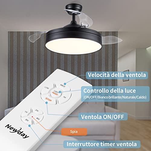 Newday Ventilatore da Soffitto 107 cm con Luci e Telecomando, Ventilatore da Soffitto Retrattile con 3 Pale Invisibili, Motore Silenzioso e Luci LED Luminose, Temporizzazione