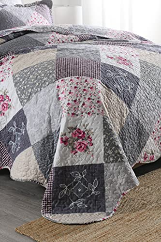NEWLAKE copriletto Set di copriletti Trapuntati in Formato Matrimoniale 3 Pezzi Set copriletto Reversibile Leggero con 2 Federa (Motivo Patchwork Floreale Grigio, Queen Size/230 * 250cm