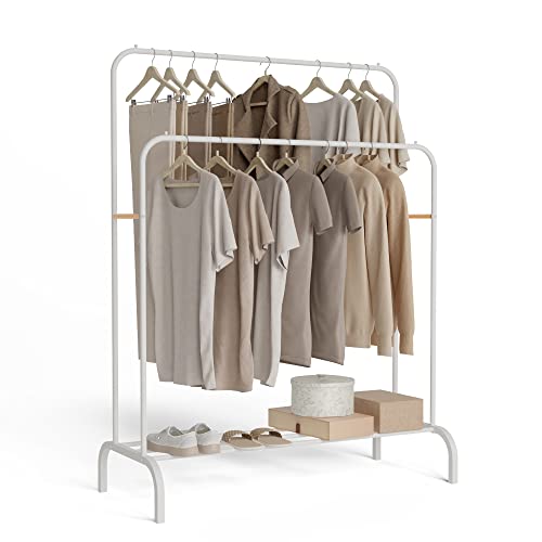 Barre doppie da appendere. Questo asino resistente ha molto più spazio rispetto agli altri, poiché ha due altezze (131 cm e 101,5 cm ogni barra) per distribuire i capi in base alle diverse lunghezze. La distanza di 21,5 cm tra le barre lascia spazio sufficiente per appendere due file di vestiti.