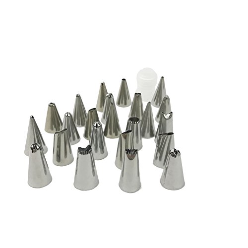 NewPI Set 24 Beccucci Decorativi in Acciaio per Sac a Poche /Tasca del Pasticcere / Tasca da Pasticciere come Torte, Biscotti, Meringhe, Pasticcini, Tulipano e Tante Altre Creazioni.Confezione da 24 Pezzi Beccucci Decorativi in Acciaio Inox + Adattato 1