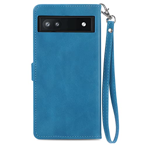 NEXCURIO Custodia a Libro Cover Portafoglio per Google Pixel 6a 5G Flip Case in Pelle Fiori Donna con Tasca Zip Porta Carte Laccio Supporto Antiurto - Blu