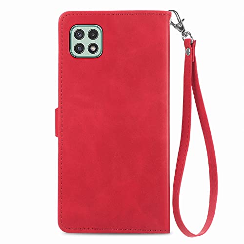 NEXCURIO Custodia a Libro Cover Portafoglio per Samsung Galaxy A22 5G Flip Case in Pelle Fiori Donna con Tasca Zip Porta Carte Laccio Supporto Antiurto - Rosso