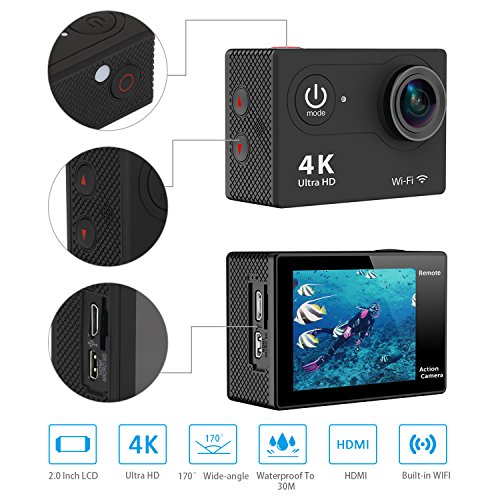 PROFESSIONALE 4K ACTION CAMERA: Display di definizione alta, 2 pollici di pannello LCD, la risoluzione di vedio a 4K 30fps/1080P 60fps provvide il pixel alta qualità. La risoluzione di 12 MP immagine con obiettivo grandangolare di 170° che permette alla cattura accurata di movimento e fornire la video chiara professionale. Non ti preoccupare più di perdere qualsiasi i scatti epici nell'avventura