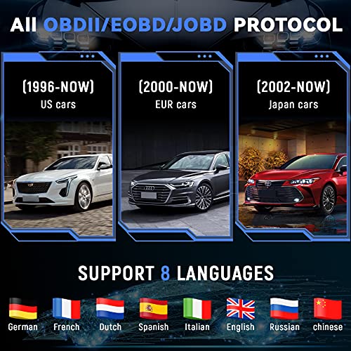 【Potente compatibilità e lingue multi-paese】 Questo scanner OBD2 è adatto per la maggior parte dei veicoli venduti nei paesi europei dopo il 2000 (EDB2) o gli ultimi accordi OBD2 venduti in altri paesi, come le auto UE e asiatiche nel 2000, inclusi ISO9141, J1850 PWM, veicoli domestici J1850 VPW, KWP2000 e CAN. Supporta menu m