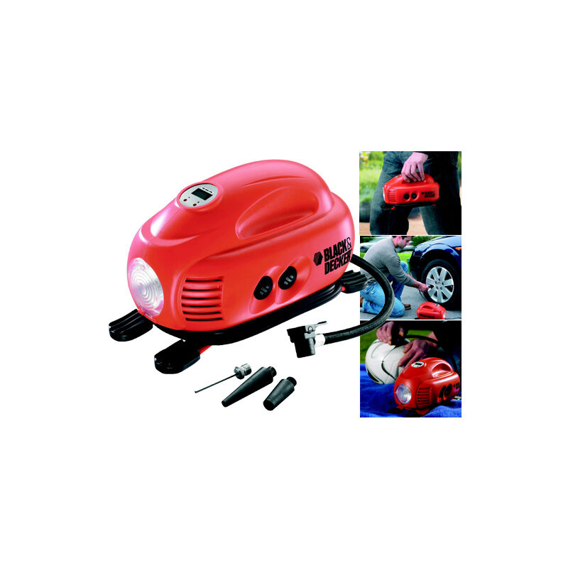Compressorre compatto e maneggevole, piccolo e comodo da trasportare, 120psi/8,27 bar, funzionamento presa accendisigari 12 volt, autospegnimento, quadrante digitale retroilluminato, luce led integrata, in dotazione ugelli