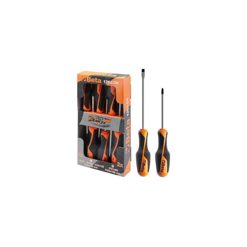 SERIE DI 6 PEZZI PER MECCANICO. L'IMPUGNATURA BIMATERIALE HA VANTAGGI ERGONOMICI SOSTANZIALI. LA PUNTA è PRIVA DI CROMATURA ED è PROTETTA DALL'OSSIDAZIONE CON UN TRATTAMENTO DI FOSFATAZIONE. CONFEZIONE CONTENENTE: 0,5X3X75 - 0,8X4X100 - 1X5,5X125 - 1,2X