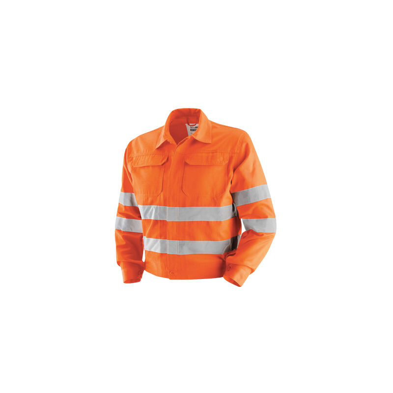 Giubbino 60% cotone e 40% poliestere, peso 240 g/mc., 2 tasche al petto con patta e velcro, collo a camicia a doppio tessuto, chiusura frontale con bottoni ricoperti da patta, maniche con polsini chiusura a bottone, cintura in vita in doppio tessuto con c