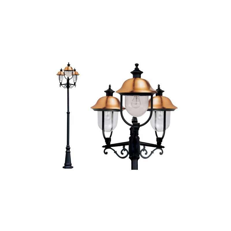 In alluminio pressofuso, copertura finitura ramata, schermo termoplastico trasparente. attacco e27 - ip44. dimensioni h max 260 cm. (palo estensibile)