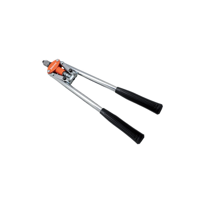 Corpo in alluminio ultra resistente, con manici in acciaio temperato rivestiti in resina termoplastica, adatta per rivetti fino a ø 4,8 mm.