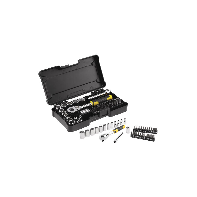Set 37 pezzi con attacco 1/4. pz. 1 cricchetto a 72 denti - pz. 12 chiavi a bussola poligonali (4-4,5-5-6-7-8-9-10-11-12-13-14 mm) - pz. 1 prolunga 75 mm. - pz. 1 chiave a bussola porta inserti - pz. 22 inserti (poz. 1-2-3;