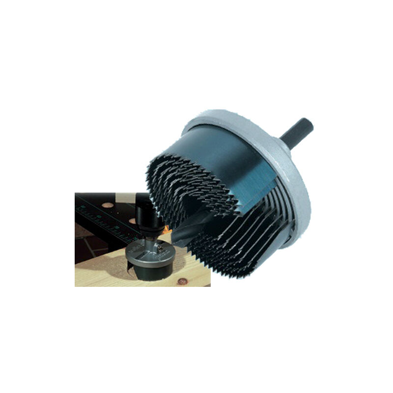 Corpo in metallo compreso di 1 punta centrante 㘠8 mm., 7 lame a cambio rapido (㘠25, 32, 38, 45, 50, 56, 62 mm.), codolo esagonale, profonditã di taglio 23 mm. adatto per legno, cartongesso, pannelli da costruzione