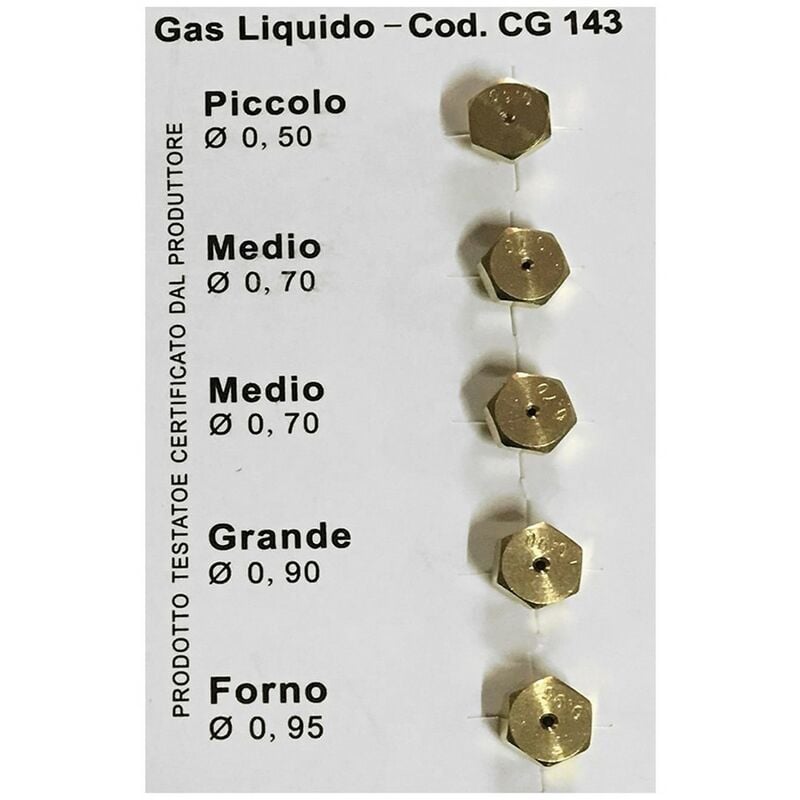 In kit da 5 pezzi. composizione: 1 pezzo piccolo ø 0,50, 2 pezzi medio ø 0,70, 1 pezzo grande ø 0,90, 1 pezzo forno ø 0,95.per gpl