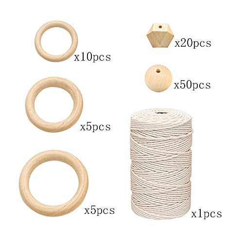 Niaciswe 90 Pezzi Sfere di Legno Anelli Legno Macrame Rotonde Perline Legno Cerchio Legno Perline di Legno Naturali Macrame Accessorimacrame Kit con Macrame Corda per Fai da Te Artigianato
