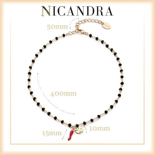 NICANDRA Quadrifoglio Donna Collana Catena Cristalli Neri Cornetto E Quadrifoglio Oro - Realizzato in Italia Busta e Sacchetto Regalo Inclusi