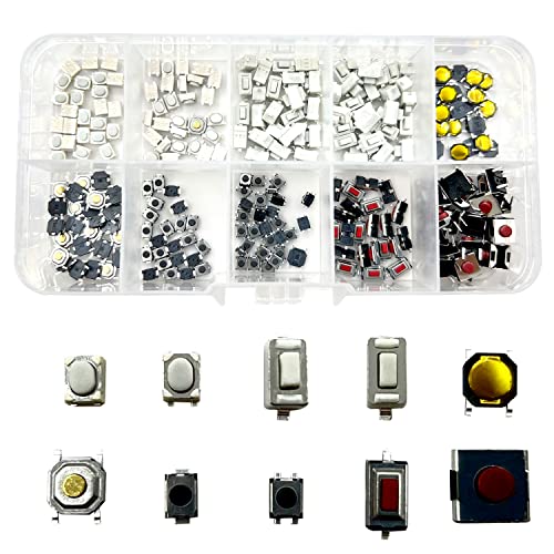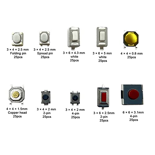 Dimensioni: questo set di interruttori a pressione contiene un totale di 250 micro interruttori e ci sono 10 diversi tipi di interruttore, 25 pezzi. 10 valori inclusi: 3x4x2,5mm, 3x4x2,5mm, 3x6x4,3mm, 3x6x5mm, 3x4x2mm (2P), 3x4x2mm (4P), 4x4x1,5mm, 4x4x0,8mm, 3x6 2,5mm, 6x3,1mm