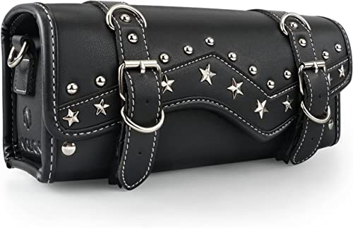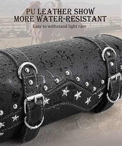 NICECNC Borsa Manubrio Moto Punk Vntage, Borsa Forcella Moto In Pelle di Vacchetta Classica Linee Rivetto Stile Rock, Cinghie di Fissaggio Rinforzate Borsa Attrezzi Moto Sissy Bar, Nero