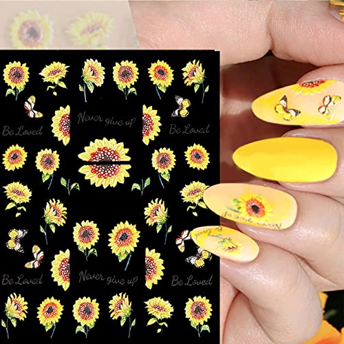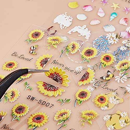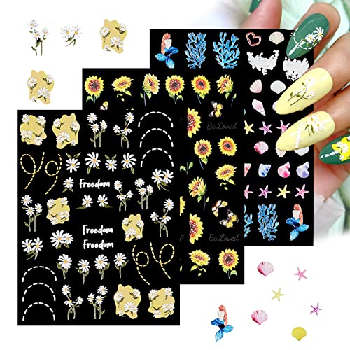 NICENEEDED Adesivi per Nail Art con Girasole Margherita In Rilievo 5D, 3 foglio di Decalcomanie per Unghie A Tema Floreale Oceano Squisito, Autoadesivi Stereoscopici per L'Autunno Primaverile