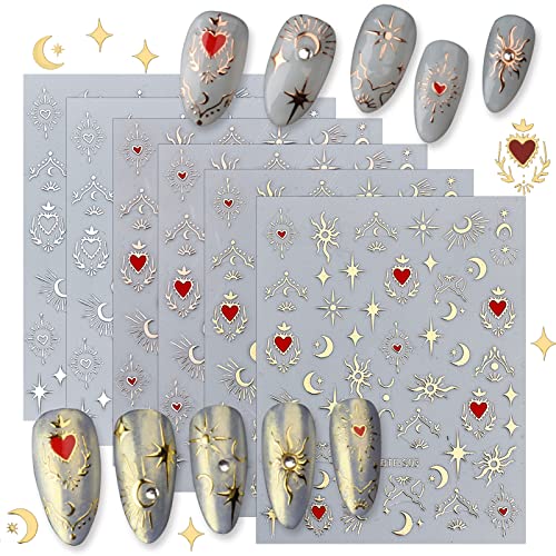 NICENEEDED 6 Foglio Abbronzante Sole Stella Luna Nail Art Stickers, Decalcomanie per Unghie Autoadesive A Cuore In Oro Rosa, Starlight Moon Design Stickers Decorazione per Unghie per Donne Ragazze