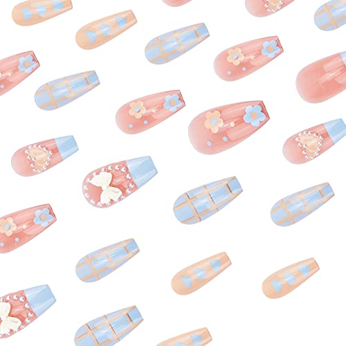 NICENEEDED Pink Blue Press On Nails Lunghezza Lunga, Carino Kawaii Heart Pearl Blue Plaid Ballerina Unghie Finte, Unghie Acriliche A Copertura Totale Da 24 pezzo con Adesivi per Colla per Unghie per