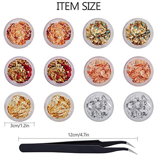 NICENEEDED Foil Nail Art Chip Kit 12 Scatole Foil Nail Chip Glitter Oro Argento Nail Foil Paillette Oro Argento Rame Arcobaleno Foil Fiocchi Brillanti Con 1 pinzette per Nail Art Decorazione di Design