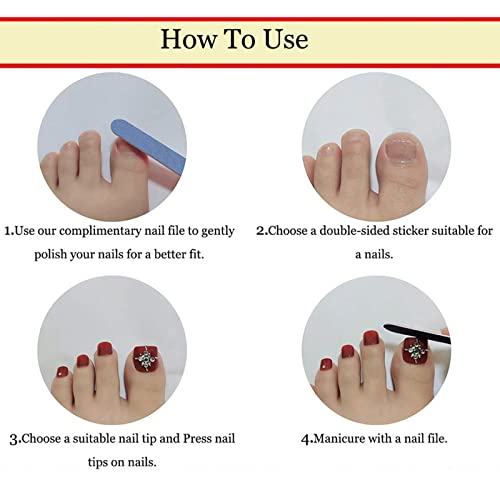 STRUMENTI COMPLETI: 24 pezzo di unghie finte con 1 adesivi per colla per unghie, 1 bastoncino di legno e 1 lime per unghie, con questo set di strumenti, puoi avere unghie dei piedi attraenti.