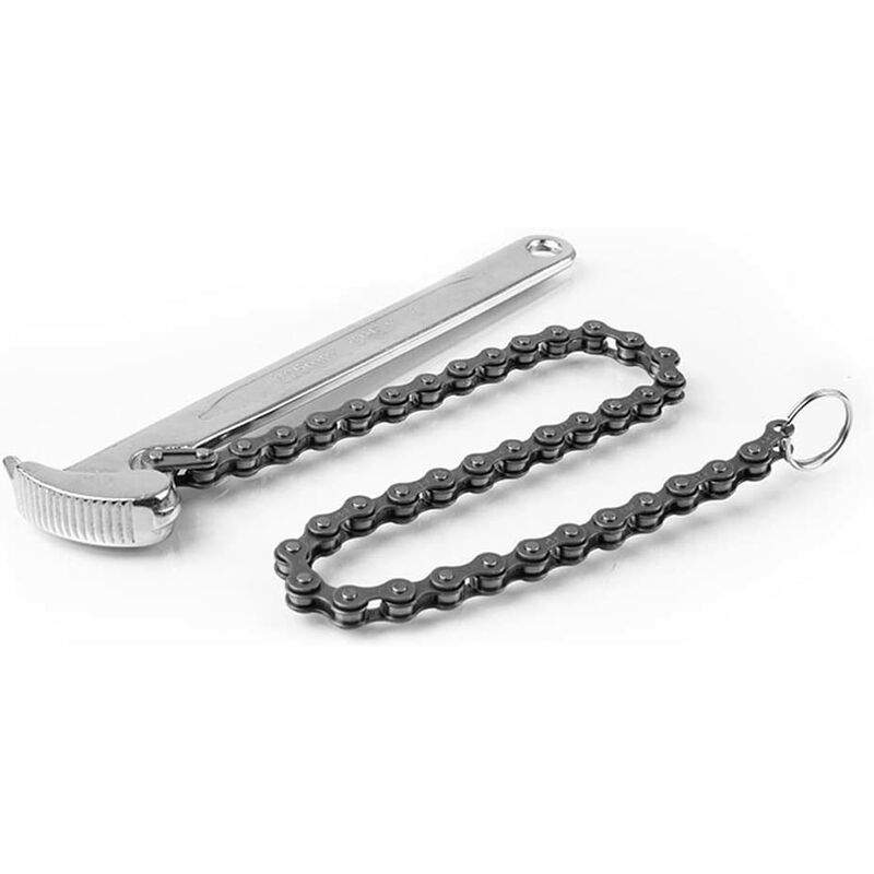 facile affilatura se necessario. Cromato per resistere alla ruggine, per durare nel tempo. Forte manico a forma di I. Dimensione manico: 310 mm. Lunghezza della catena: 410 mm. Descrizione del prodotto La chiave a catena da 12 è progettata per lavorare in aree ristrette dove le chiavi dei normali tubi non entrano. Eccellente per raccordi per tubi. Specifiche: Dimensioni: 310 mm. Peso: 1 kg. Contenuto: 1 chiave a catena da 30,5 cm.