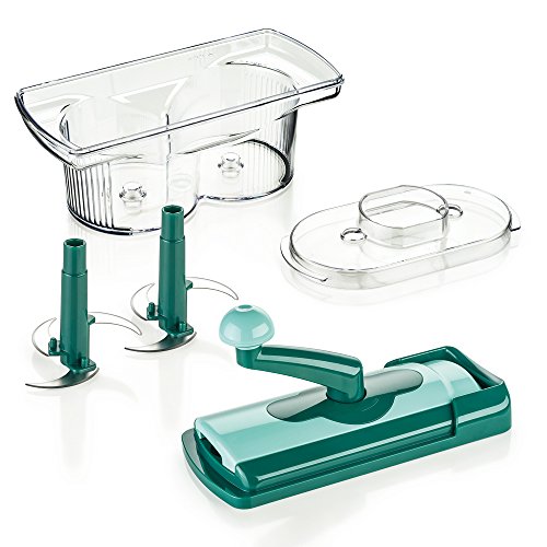 Contenuto della confezione: 1 contenitore trasparente da 1,75 l, 2 lame in acciaio inox, 1 coperchio trasparente antiproiezione, 1 coperchio con manico rimovibile